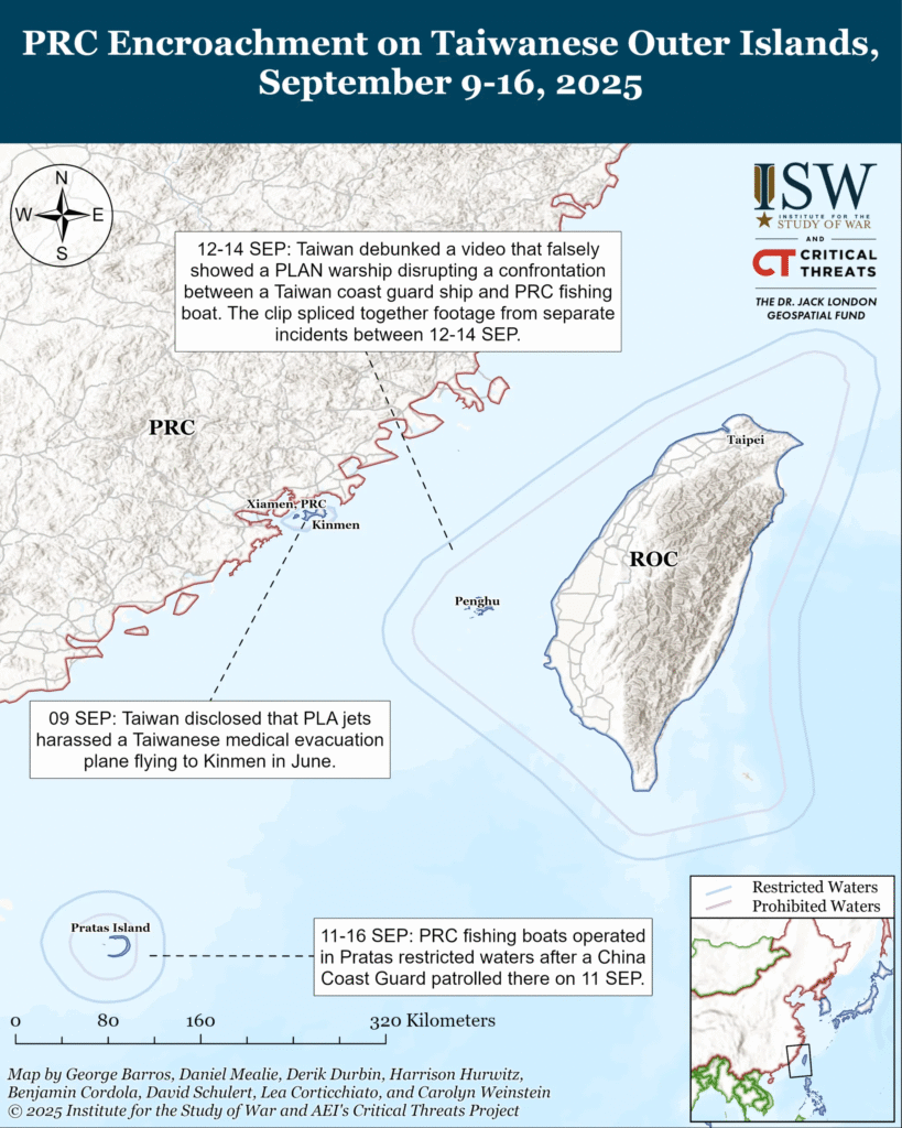 The PRC may be preparing to expand its efforts to erode Taiwanese sovereignty to the Penghu archipelago. A doctored video has circulated on TikTok and other online media platforms in recent days, purportedly showing a PLA Navy ship blocking Taiwan’s Coast Guard Administration (CGA) law enforcement operations against a PRC fishing vessel in the Penghu contiguous zone. The CGA debunked the video on September 14, stating that the video deceptively combined footage from two separate incidents.[7] The first incident was the CGA expelling a PRC fishing vessel from the Penghu contiguous zone, while the second was the CGA encountering a PLA Navy ship a day or two later. The PLA Navy ship did not prevent the CGA from expelling the PRC fishing vessel, as the doctored video alleged. The CGA accused the PRC of promoting the video as a cognitive operation, possibly meant to intimidate Taiwanese leaders and the public as well as normalize the PLA Navy operating near the Penghu islands.[8] The Penghu islands are entirely inside Taiwanese territorial waters and would be strategically significant in any PRC attack on Taiwan given the proximity of the archipelago to the Taiwanese main island.[9] The US Taiwan Relations Act, the basis for the unofficial relations between the United States and Taiwan, includes the Penghu Islands in its definition of “Taiwan” but does not mention other outlying islands.[10]
