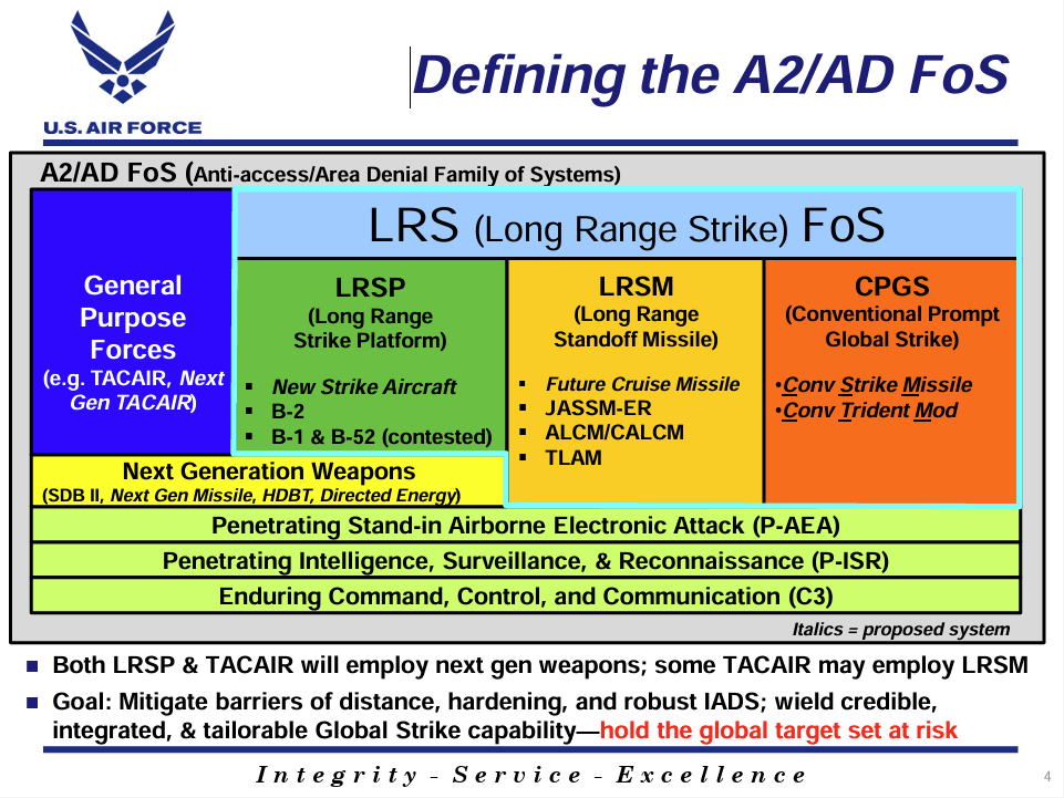 In 2010, the USAF’s plans for investment in long-range strike were firming up. After its plans for an ultra-capable and expensive Next Generation Bomber had been cancelled in 2009, it reformulated its program as a Long-Range Strike Family of Systems (LRS-FoS) that would deliver the same capabilities at lower risk.